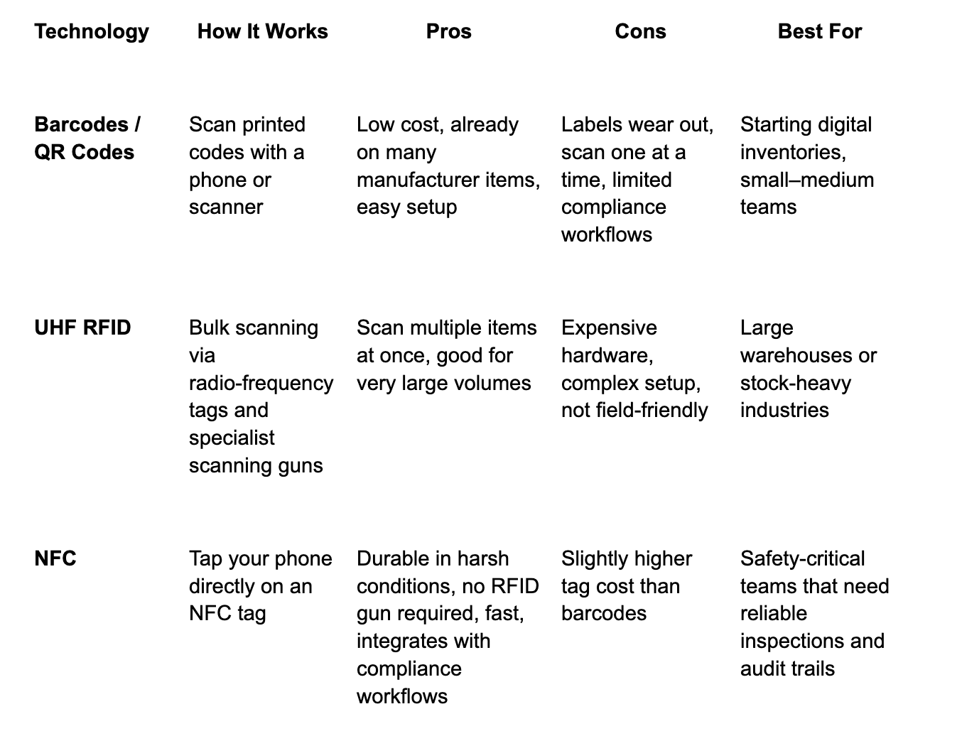 When choosing a compliance tracking system, here’s how the main technologies compare:For most safety equipment teams, NFC is the sweet spot: durable, reliable, and designed for compliance - but Scannable also makes it easy to work with existing barcodes.