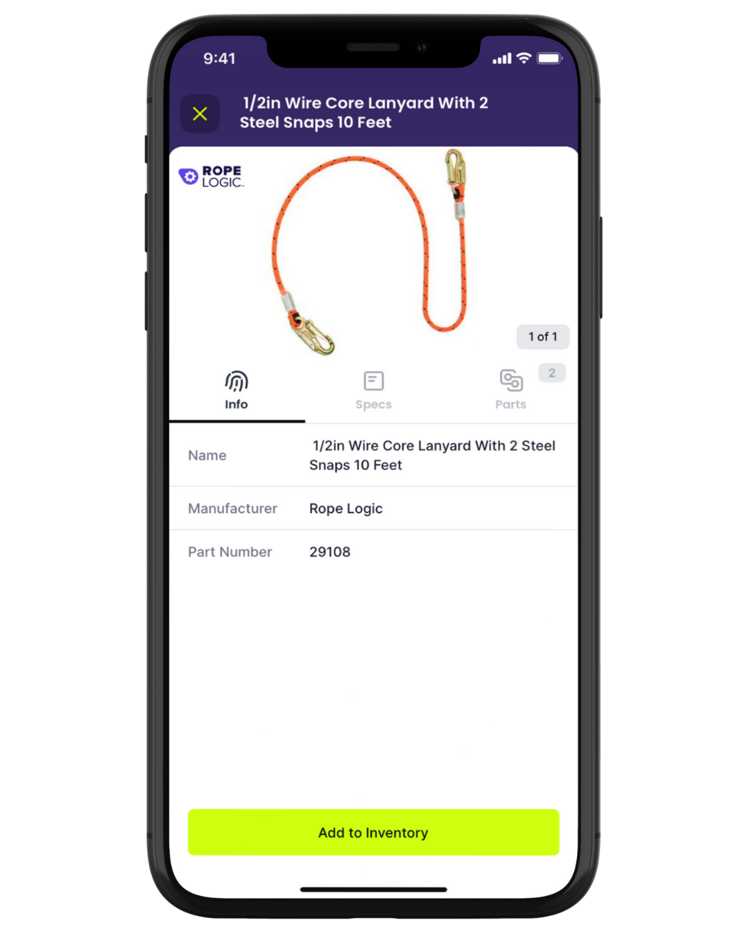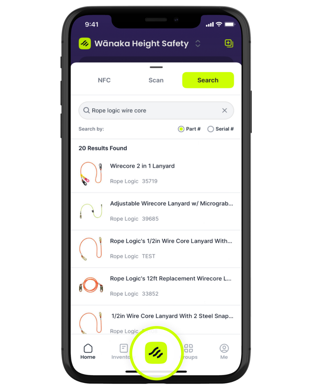 Tapping "Scan" will allow you to scan a 2D code (QR or data matrix), or you can search by name, serial number, or part number.